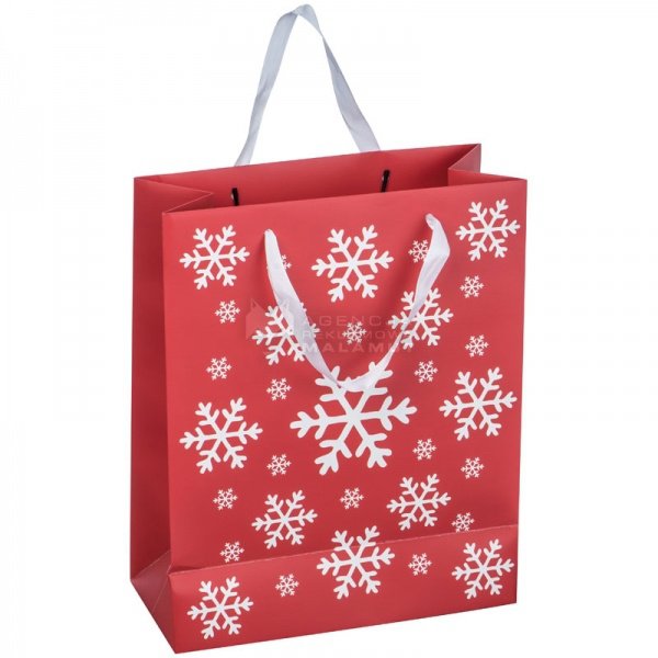 Świąteczna, papierowa torba na prezenty z dwoma uchwytami, z motywem śnieżynek.