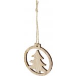 Ozdoba drewniana w kształcie okrągłym z choinką w środku. Posiada zawieszkę i sznurek. Pakowane pojedynczo z kartką z papieru kraft z tyłu.
