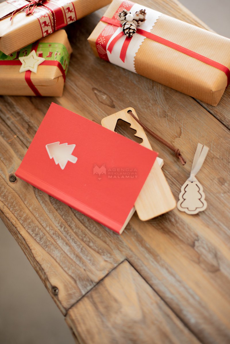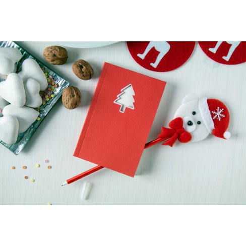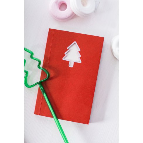 Notes 85 kartkowy z kartonową okładką i wyciętym świątecznym drzewkiem.