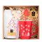 Zestaw preznentowy do kawy w tekturowym pudełku z wypełnieniem dekoracyjnym z wełny drzewnej i czerwoną wstążką. Zawiera: kubek „Komagu”; kawę „Luis” Costa Rica (40 g); cantuccini „Floq” (100 g); brelok świąteczny „Korkki”.