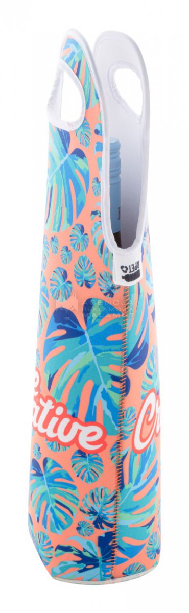Personalizowana, neoprenowa torba na butelkę wina RPET z uchwytami. Z nadrukowaną grafiką sublimacyjną na całej powierzchni. Min. ilość: 50 szt.