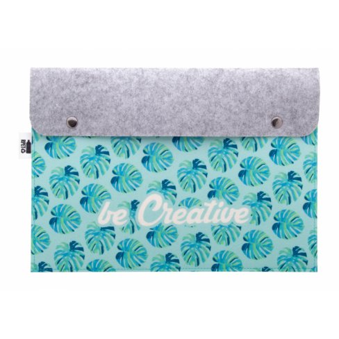 Personalizowana teczka na dokumenty z filcu RPET (format A4) z full kolorowym nadrukiem z przodu i zapięciem na zatrzask. Z charakterystyczną metką RPET. Z nadrukowaną grafiką sublimacyjną. Min. ilość: 50 szt.