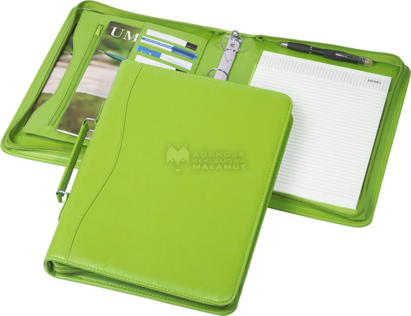 Portfolio zapinane na zamek z uchwytem, kółkami segregatora, zapinaną na zamek kieszonką i kieszeniami na dokumenty. W zestawie 20-kartkowy notatnik w linie. Nie zawiera długopisu i akcesoriów. Imitacja skóry.