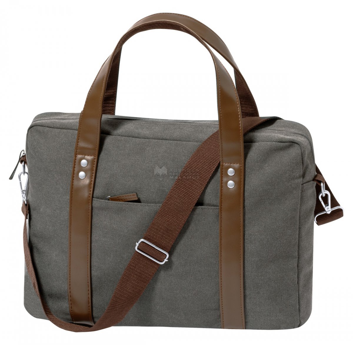 Płócienna teczka na dokumenty z zapinaną na zamek komorą główną i przednią kieszenią. Z wyściełaną przegrodą na laptopa (15") i tablet (10"), regulowanym paskiem na ramię, detalami i uchwytami ze skóry PU.