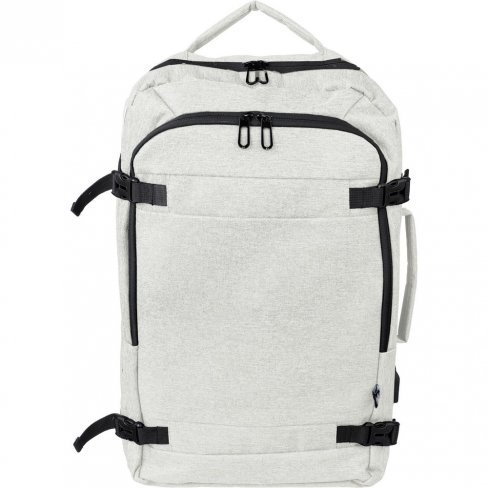 Plecak na laptopa 17" z podszewką wewnątrz, pojemność plecaka to 1 l, uchwyty do noszenia w dłoni lub powieszenia plecaka znajdują się na górze i z boku, dwie duże przegrody zapinane na zamek, jedna z przegrodą na laptopa 17", zamykana gumką zapinaną na rzep, a druga zawiera kilka małych przegródek, z przodu mała kieszonka zapinana na zamek, wentylowane, wyściełane wnętrze, z tyłu pasek do wózka i kieszeń zabezpieczająca przed kradzieżą, posiada otwór USB-A z boku do podłączenia telefonu do powerbanku wewnątrz plecaka (brak w zestawie), ikona RPET na metce, produkty wykonany z RPET, poliestru, siatki i pianki