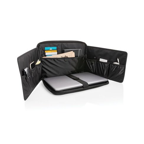 Pokrowiec na laptopa 15.6", po rozłożeniu pokrowiec pełni funkcję stacji roboczej, wiele kieszeni wewnątrz, regulowany pasek na ramię, pasek do zamocowania na walizce, na zewnątrz wykonany ze skóry wegańskiej (100% PU), wewnątrz poliester 210D, nie zawiera PVC