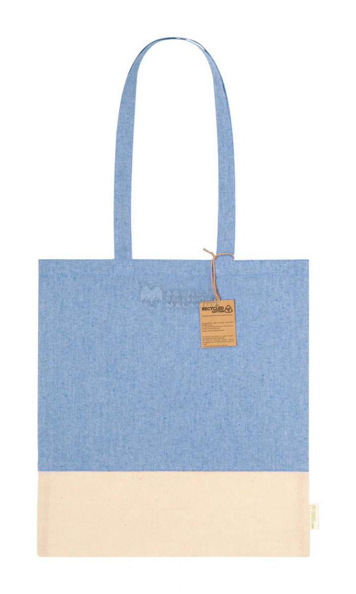 Dwukolorowa torba na zakupy z bawełny pochodzącej z recyklingu, z długimi uchwytami i charakterystyczną metką informującą o bawełnie pochodzącej z recyklingu. 100% bawełna z recyklingu, 120 g/m².