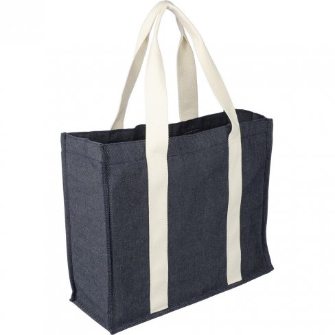 Torba na zakupy z denimu, długie płócienne uchwyty (długość 120 cm, szerokość 35 mm i grubość 2 mm - 280 g/m²), guzik do zamykania torby, produkt wykonany z denimu, poliestru i bawełny