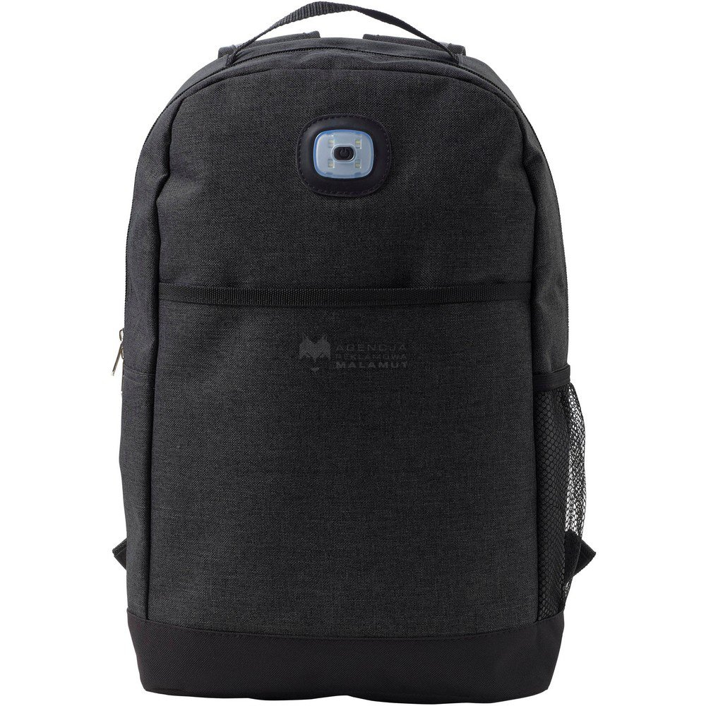 Plecak z lampką, 2 tryby świecenia (biały i czerwony), główna przegroda na zamek błyskawiczny, kieszeń przednia oraz boczna kieszonka siateczkowa