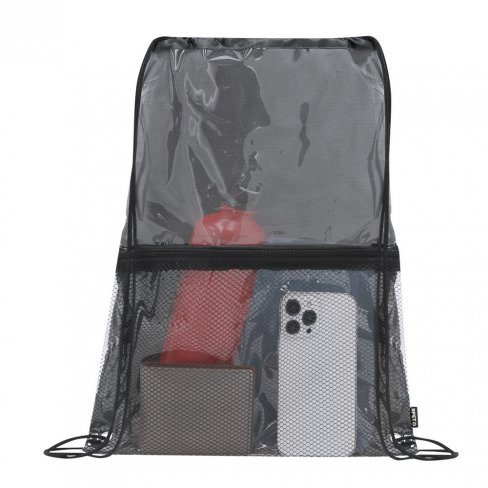 Worek ze sznurkami, sznurek umożliwia noszenie na plecach, pomieści drobne zakupy lub strój sportowy na siłownię, produkt wykonany z RPET poliestru i PVC