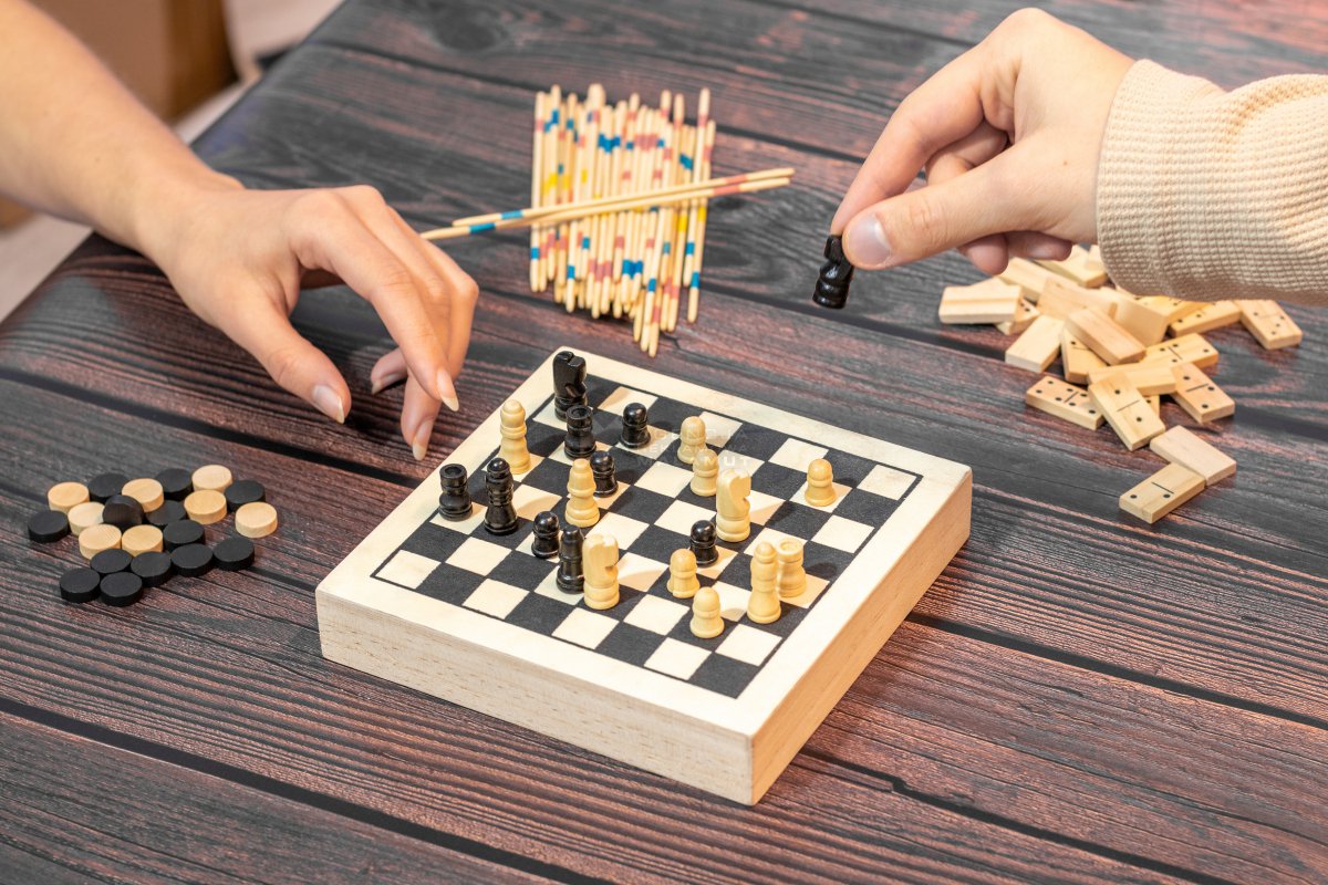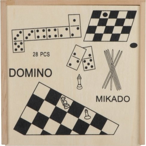 Drewniane pudełko skrywające wewnątrz 4 różne gry - szachy, warcaby, mikado oraz domino.