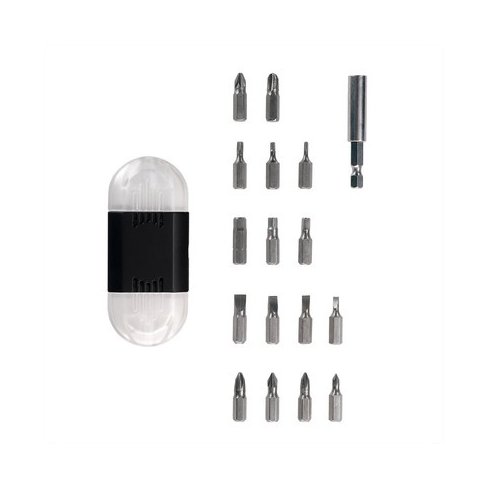 Zestaw narzędzi 16 el. w pudełku, w komplecie 4 bity płaskie, 6 bitów krzyżakowe, 3 bity typu gwiazdkowe oraz 3 bity imbusowe