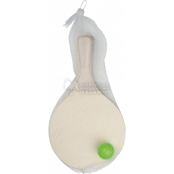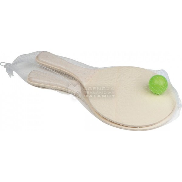 Zestaw plażowy do gry, zawiera dwie paletki wykonane z drewna z plastikowym uchwytem oraz piłeczkę. Paletki zapakowane w siatkę.