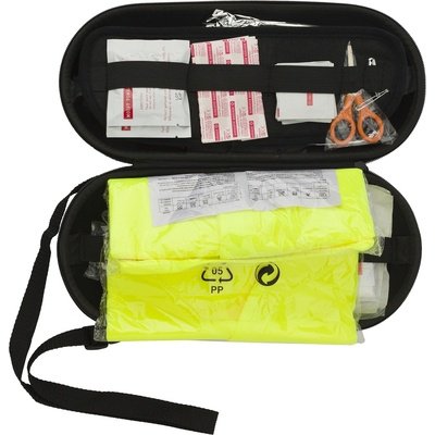 Apteczka samochodowa w pokrowcu, główna przegroda na zamek błyskawiczny, wewnątrz: latarka na dynamo, srebrny koc termiczny, płatki dezynfekujące alkoholowe (8 szt.), plastry (15 szt.), chusteczki odświeżające (4 szt.), nożyczki, agrafki (2 szt.), kamizelka bezpieczeństwa, taśma, bandaż (2 szt.), bandaż trójkątny, waciki sterylne (2 x 5 szt.)